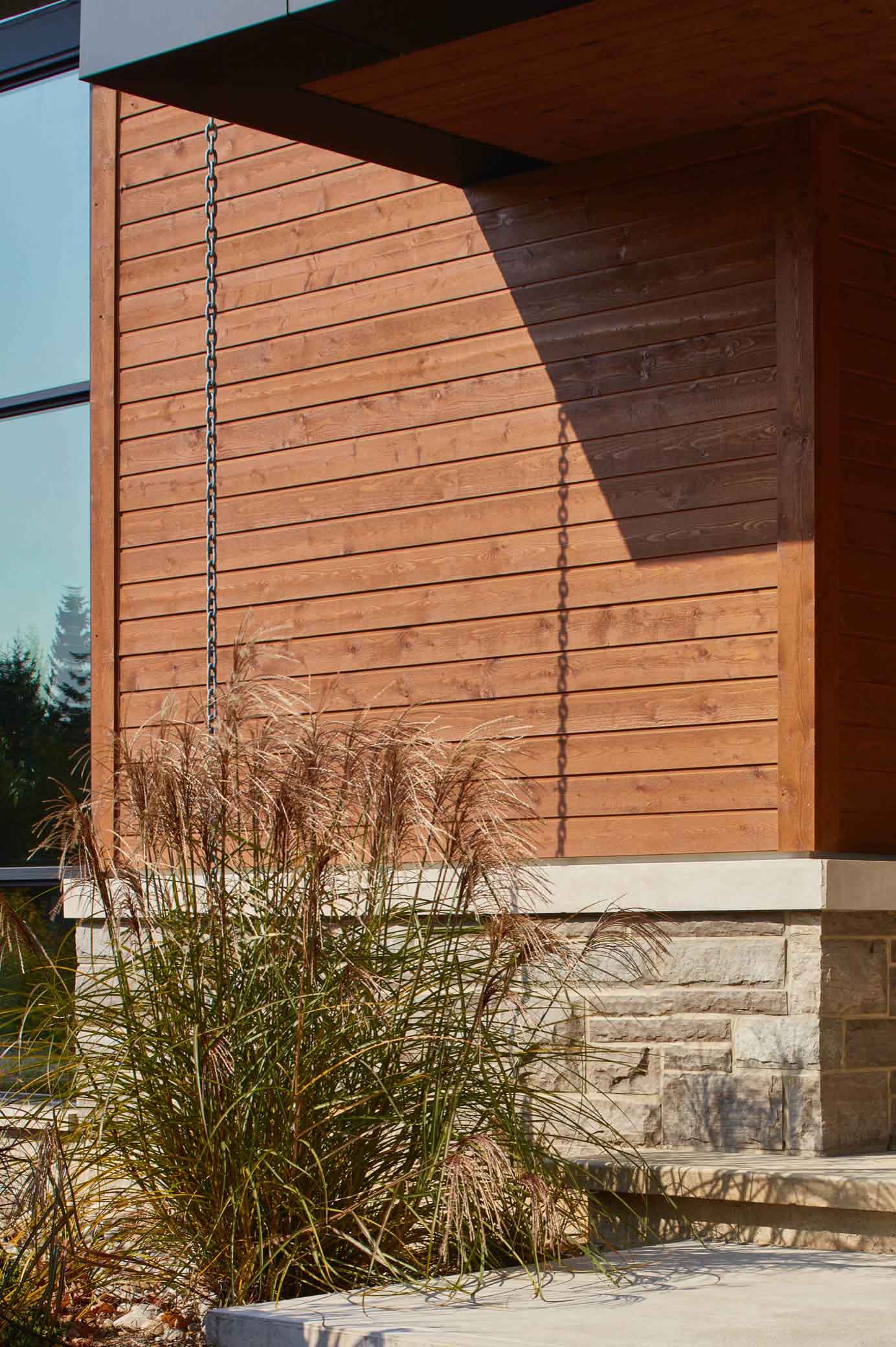 Inspired by contemporary West Coast architecture, this home features Wiarton stone and stucco amalgamated with textural wood siding that leads into a beautiful interior. Stone accent walls, 14' ceilings and large format porcelain tiles create a natural environment, complimented by black aluminium “Big Foot” windows, a floating mono stringer staircase with walnut treads and glass guardrail and a corner linear fireplace. An outdoor dining and BBQ area with motorized screens extends the living space outside.